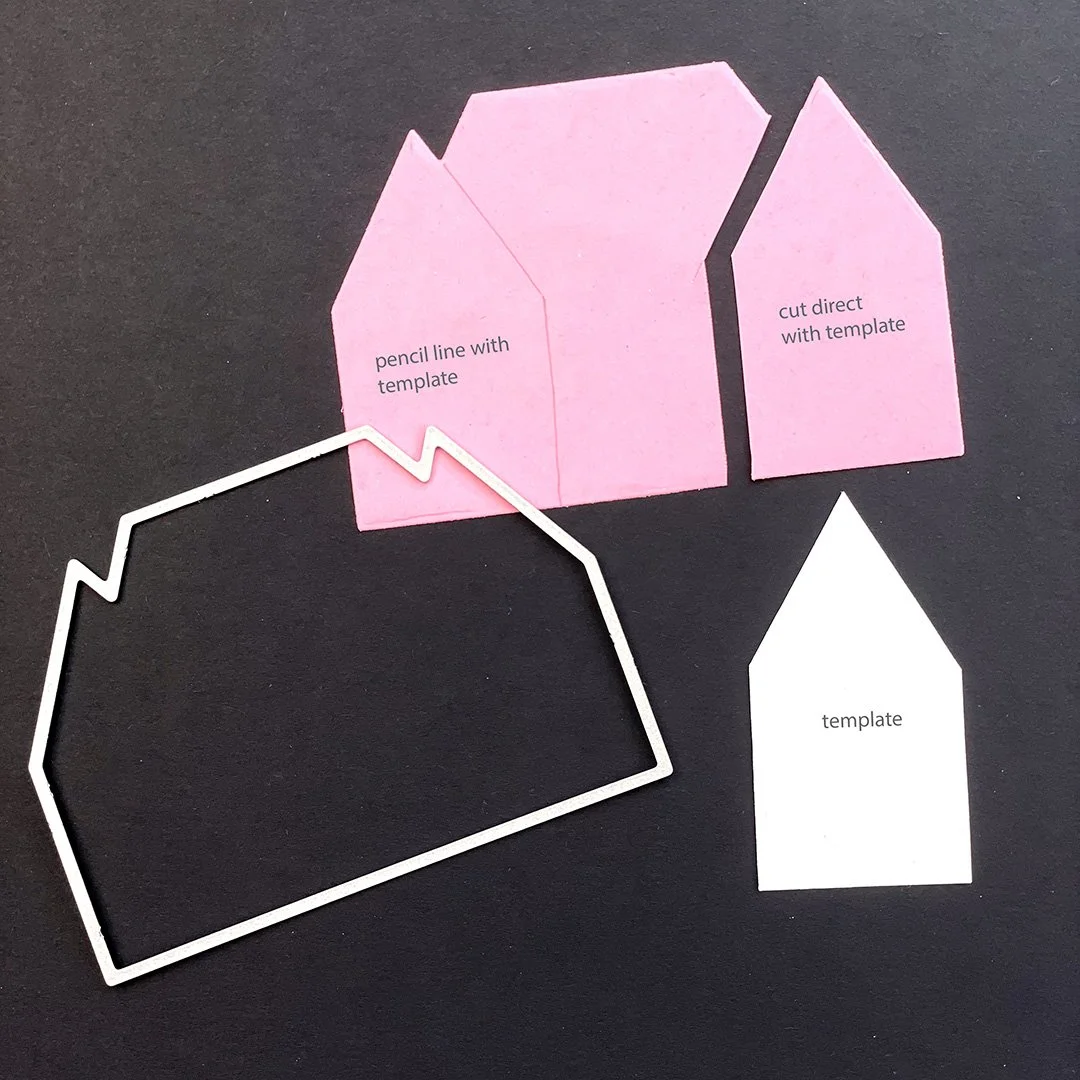 Continue to die cut the main house peice out of multiple colours of card stock. Two mini houses can be cut from each main house die cut using the template. You can either a) line up the template and cut directly around or b) trace template then cut. (See template image for reference.)