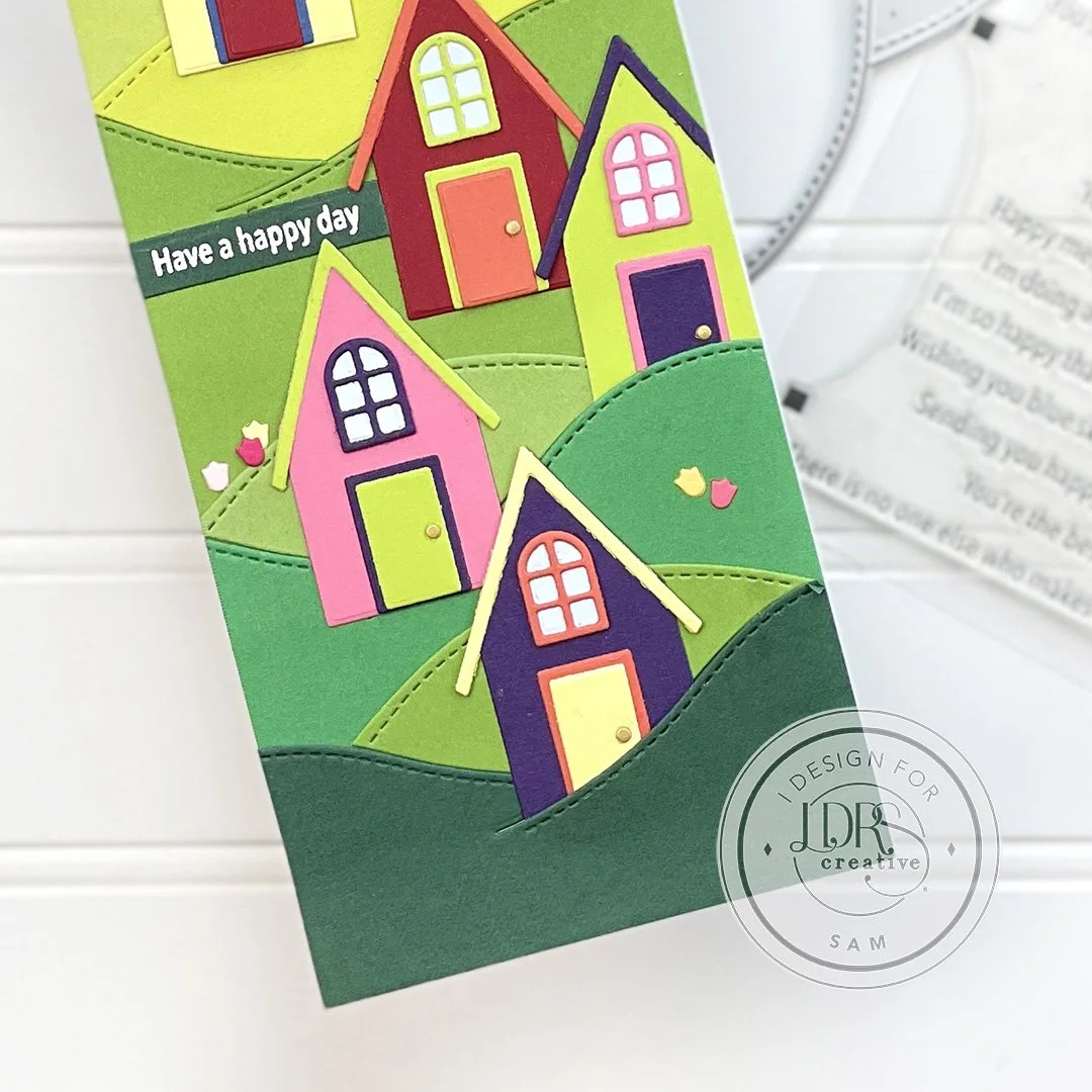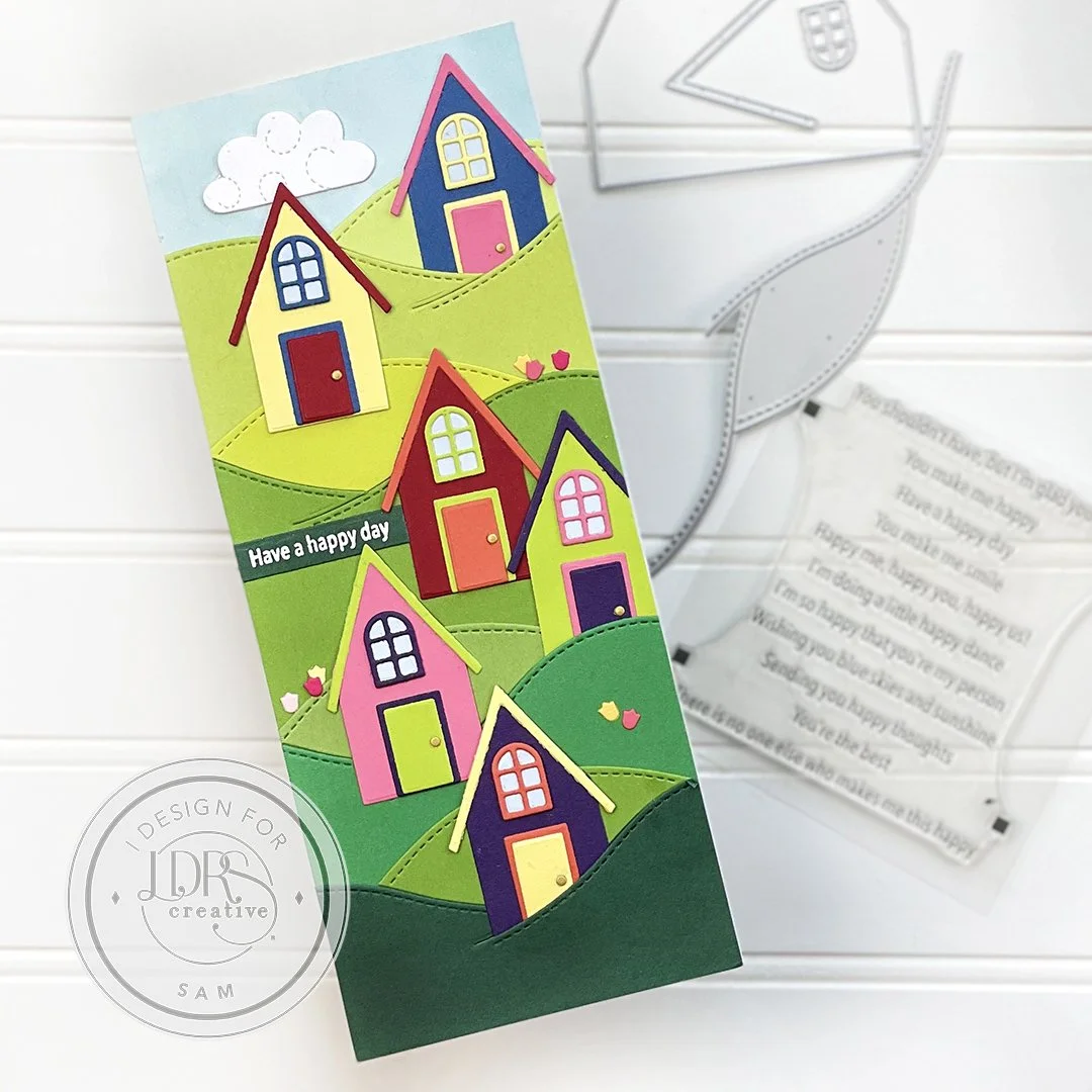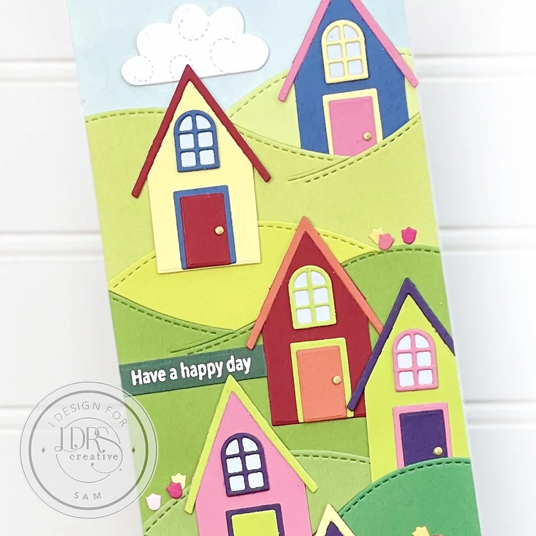 To build the card take a slimline card base that is 8 1/2” x 3 1/2” and arrange the hill sides, mini houses and any other little elements from the Home Design Dies and the Foliage Add-Ons you like.